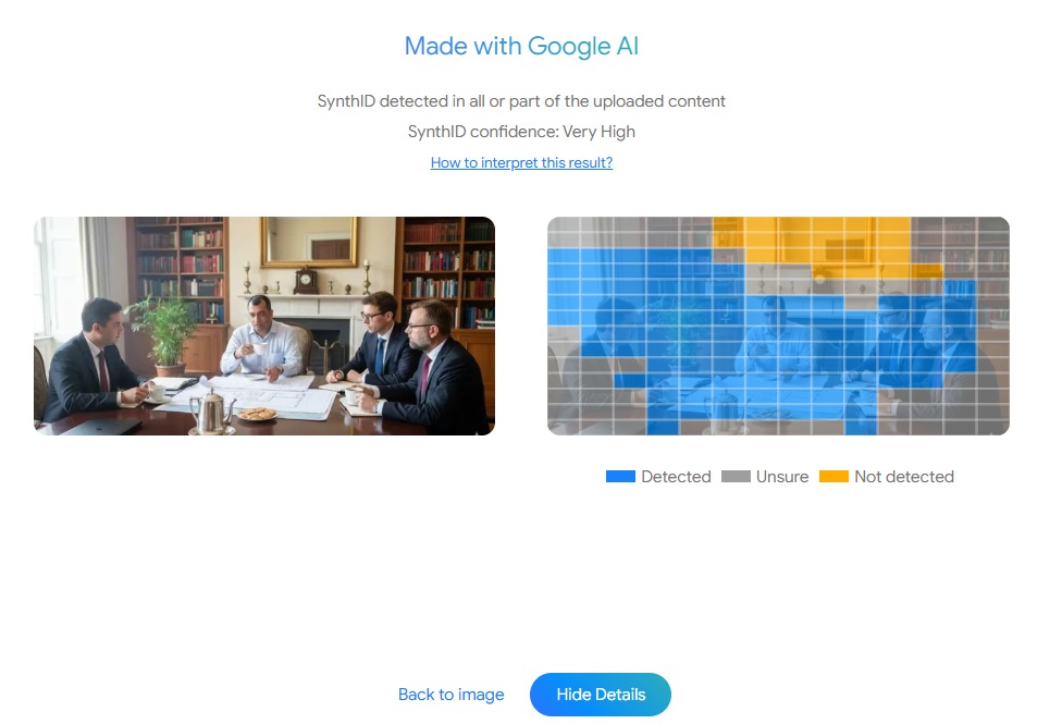 ছবিটি জেমিনি এআই দিয়ে তৈরি কি না তা যাচাই করতে রিউমর স্ক্যানার টিম গুগলের বিশেষ শনাক্তকরণ প্রযুক্তি ‘সিন্থআইডি’ ব্যবহার করে। গুগলের এই প্রযুক্তি এআই দিয়ে তৈরি ছবি, ভিডিও বা অডিওতে অদৃশ্য জলছাপ যুক্ত করে, যা খালি চোখে দেখা না গেলেও গুগলের নিজস্ব টুলের মাধ্যমে শনাক্ত করা যায়। বুম বাংলাদেশের সহায়তায় ছবিটি সিন্থআইডি দিয়ে বিশ্লেষণ করে দেখা যায়, এটি গুগলের এআই প্রযুক্তি দিয়ে তৈরি। বিশ্লেষণে ছবির পুরো বা আংশিক অংশে সিন্থআইডি শনাক্ত হয় এবং শনাক্তকরণের আত্মবিশ্বাসের মাত্রা ছিল “খুব বেশি” (Very High)।