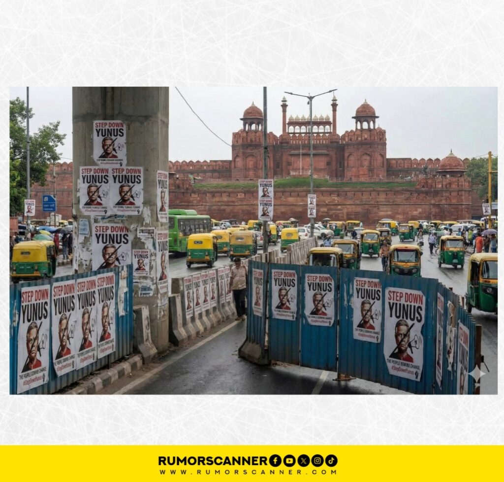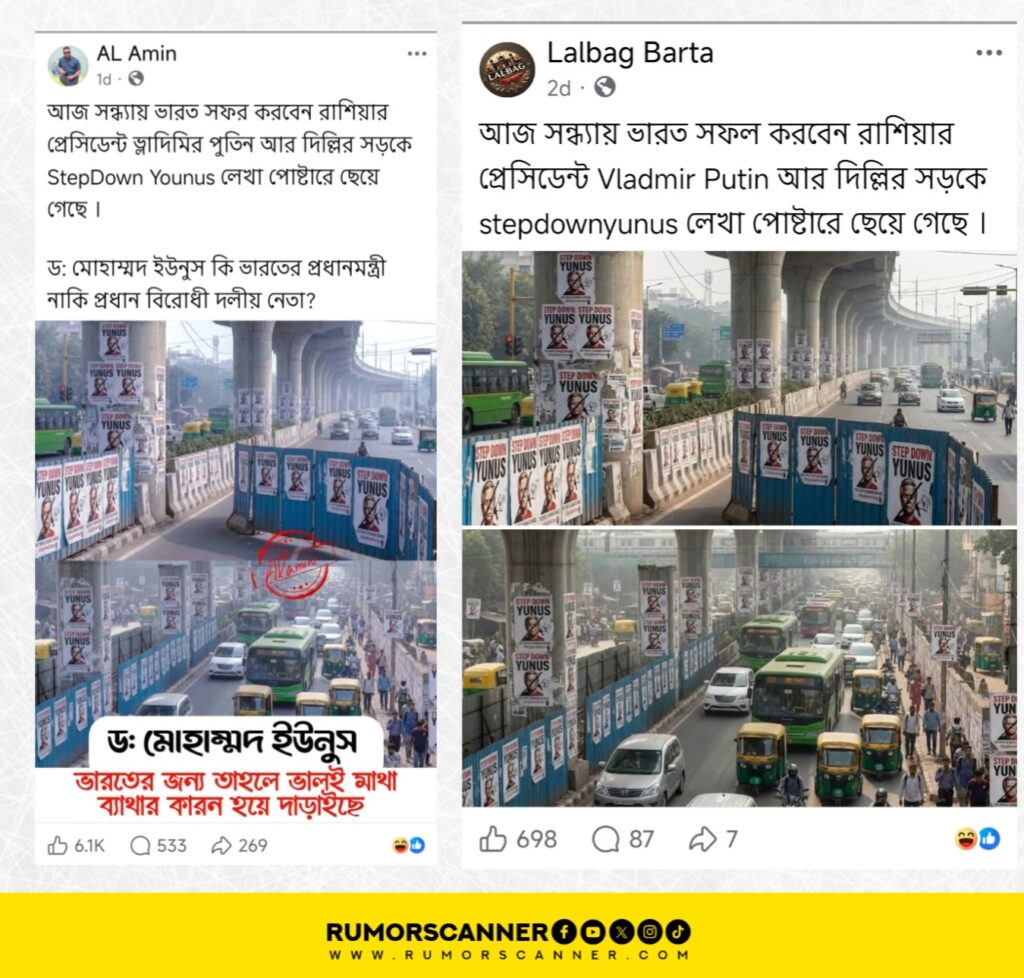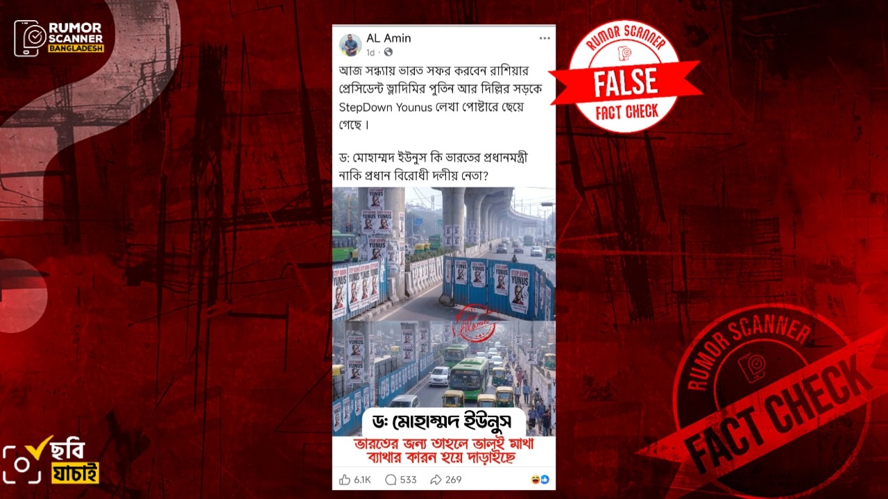 গত ৪ ডিসেম্বর রাশিয়ার প্রেসিডেন্ট ভ্লাদিমির পুতিন দুই দিনের সফরে ভারতের রাজধানী নয়াদিল্লিতে গিয়েছেন। এরই প্রেক্ষিতে সামাজিক যোগাযোগমাধ্যমে দুইটি ছবি ছড়িয়ে পড়ে, দিল্লীর রাস্তার বিভিন্ন খাম্বায় ‘Stepdown Yunus’ লেখা পোস্টার দেখা যাচ্ছে।