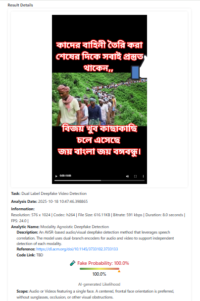 বিষয়টি আরও নিশ্চিত হতে কৃত্রিম বুদ্ধিমত্তার সহায়তায় তৈরি কনটেন্ট শনাক্তকারী টুল ‘ডিপফেক-ও-মিটার’ এর ‘AVSRDD (2025)’ মডেলের মাধ্যমে ভিডিওটি পরীক্ষা করে রিউমর স্ক্যানার। মডেলটির বিশ্লেষণে দেখা যায়, ভিডিওটি এআই দিয়ে তৈরি হওয়ার সম্ভাবনা ১০০ শতাংশ।