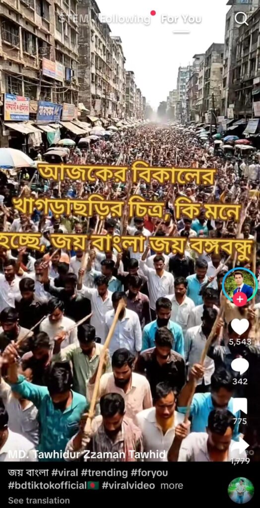 রিউমর স্ক্যানার টিমের অনুসন্ধানে দেখা যায়, গত ১১ অক্টোবর খাগড়াছড়িতে আওয়ামী লীগের মিছিল দাবিতে প্রচারিত ভিডিওটি আসল নয়। প্রকৃতপক্ষে, কৃত্রিম বুদ্ধিমত্তা বা এআই প্রযুক্তি ব্যবহার করে ভুয়া এই ভিডিও তৈরি করা হয়েছে।