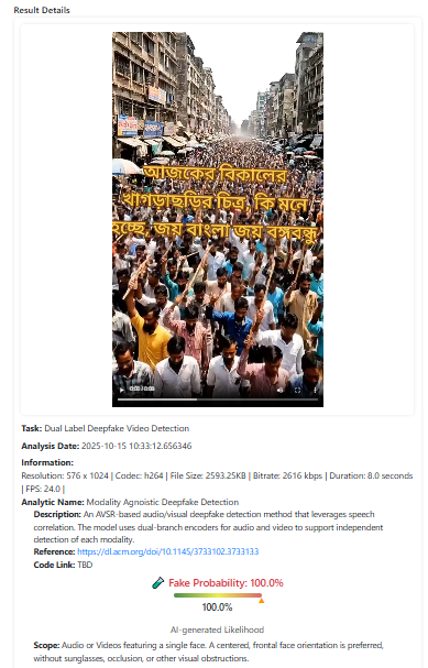 বিষয়টি আরও নিশ্চিত হতে কৃত্রিম বুদ্ধিমত্তার সহায়তায় তৈরি কনটেন্ট শনাক্তকারী টুল ‘ডিপফেক-ও-মিটার’ এর ‘AVSRDD (2025)’ মডেলের মাধ্যমে ভিডিওটি পরীক্ষা করে রিউমর স্ক্যানার। মডেলটির বিশ্লেষণে দেখা যায়, ভিডিওটি এআই দিয়ে তৈরি হওয়ার সম্ভাবনা ১০০ শতাংশ।