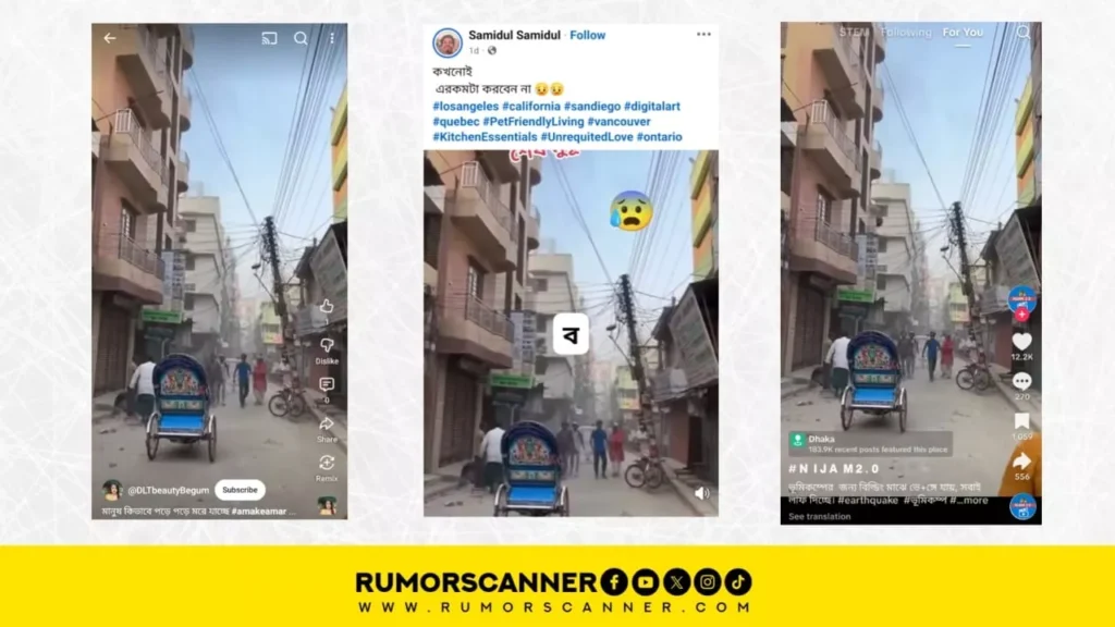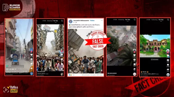 ভূমিকম্প পরবর্তী সময়ে বেশ কিছু ভিডিও সামাজিক মাধ্যমে দ্রুত ছড়িয়ে পড়েছে। যা জনমনে বেশ আতঙ্কের সৃষ্টি করে। তবে এই তথ্যপ্রবাহের মধ্যেই একাধিক ভুয়া ও বিভ্রান্তিকর তথ্যও প্রচারিত হচ্ছে। রিউমর স্ক্যানারের অনুসন্ধানে সামাজিক মাধ্যমে প্রচারিত এমন ৫টি ভিডিও কেন্দ্রিক ভুল তথ্য পাওয়া গেছে।