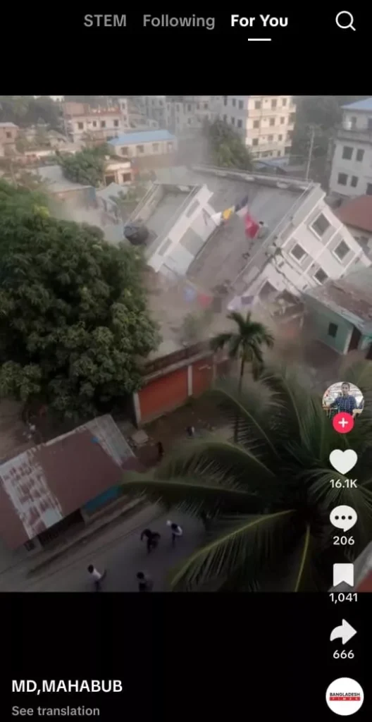 সাম্প্রতিক ভূমিকম্পে বিল্ডিং ভেঙে পড়ার দৃশ্য দাবিতে একটি ভিডিও সামাজিক যোগাযোগ মাধ্যমে ছড়িয়ে পড়েছে। এটি ছড়িয়েছে টিকটক, ইউটিউবে।