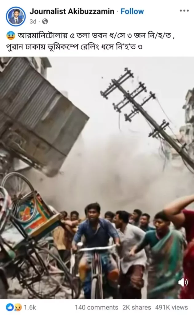 অর্থাৎ, এআই দিয়ে তৈরি ভিডিওকে আরমানিটোলা ও পুরান ঢাকায় বিল্ডিং ভেঙে মানুষ নিহত হওয়ার দৃশ্য দাবিতে প্রচার করা হয়েছে।