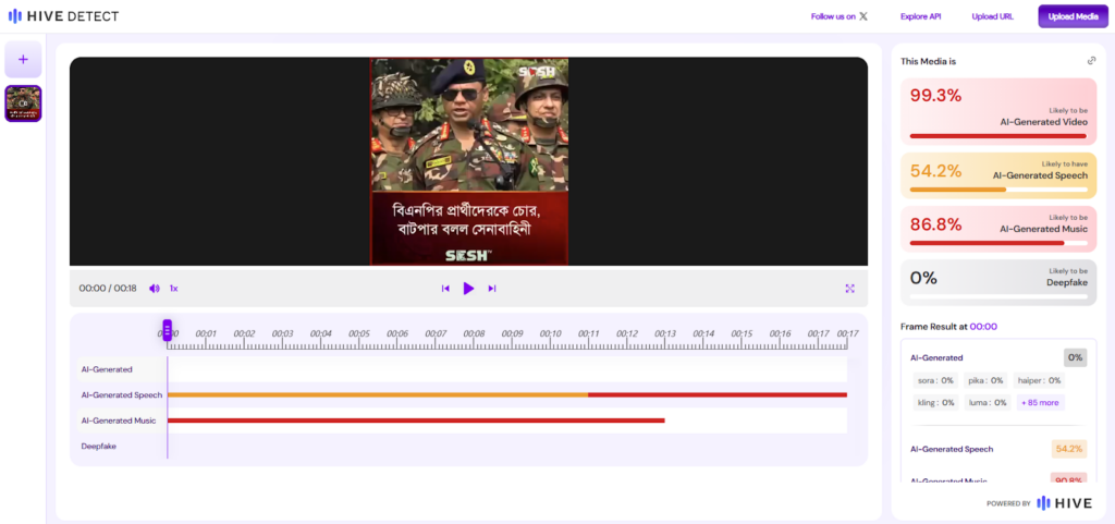 পাশাপাশি ‘ডিপফেক-ও-মিটার’ টুলের ‘AVSRDD (2025)’ মডেলের বিশ্লেষণেও ভিডিওটি এআই-নির্মিত হওয়ার সম্ভাবনা সিংহভাগ বলে জানা যায়।