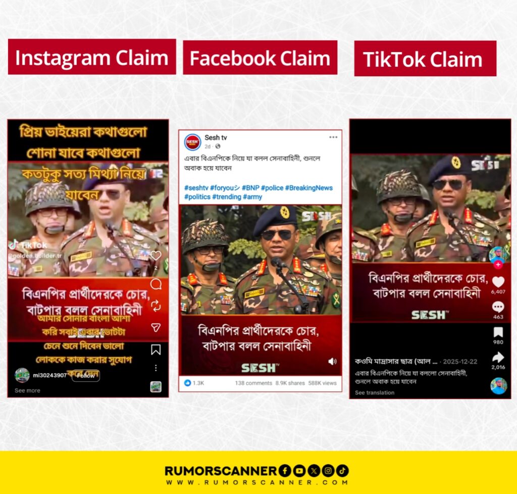 সম্প্রতি, আসন্ন ত্রয়োদশ জাতীয় সংসদ নির্বাচন ঘিরে “বিএনপির প্রার্থীদেরকে চোর, বাটপার বলল সেনাবাহিনী” শিরোনামে একটি ভিডিও সামাজিক যোগাযোগমাধ্যমে ছড়িয়ে পড়েছে।