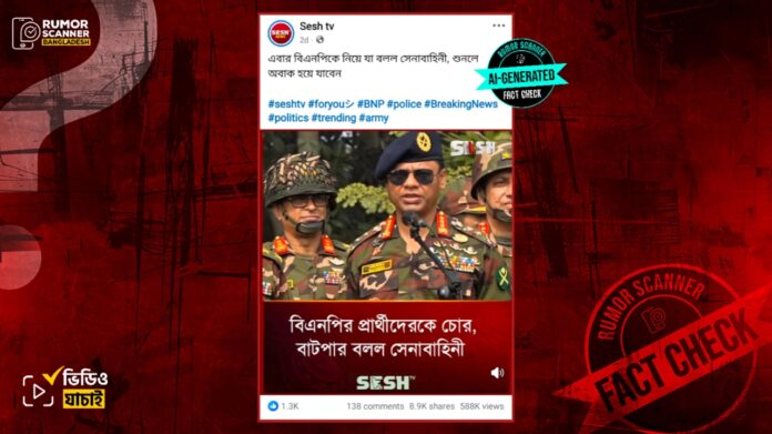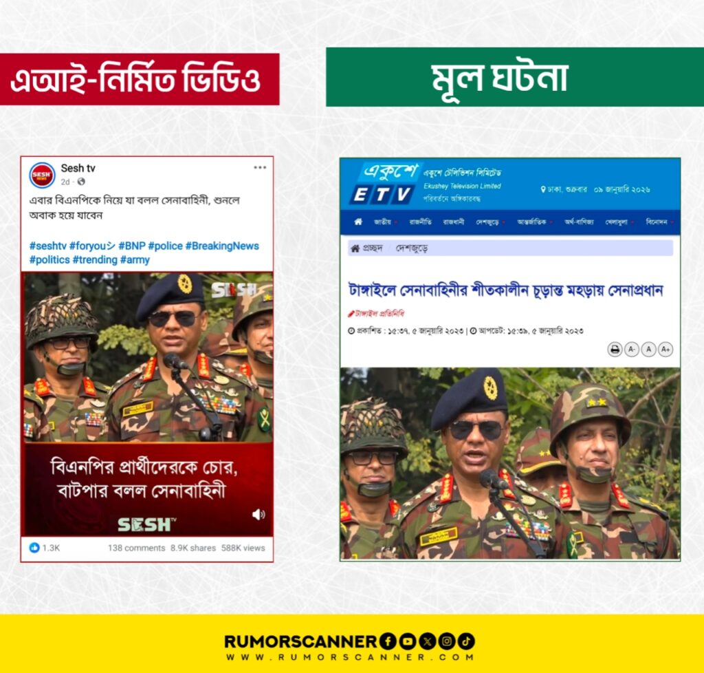রিউমর স্ক্যানার টিমের অনুসন্ধানে জানা যায়, আসন্ন ত্রয়োদশ জাতীয় সংসদ নির্বাচনে বিএনপি মনোনীত প্রার্থীদের ‘চোর-বাটপার’ বলে সেনাবাহিনীর পক্ষ থেকে কোনো বক্তব্য দেওয়া হয়নি। প্রকৃতপক্ষে, প্রচারিত ভিডিওটি কৃত্রিম বুদ্ধিমত্তা বা এআই প্রযুক্তির সহায়তায় তৈরি করা হয়েছে।