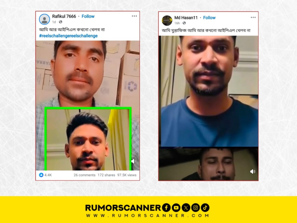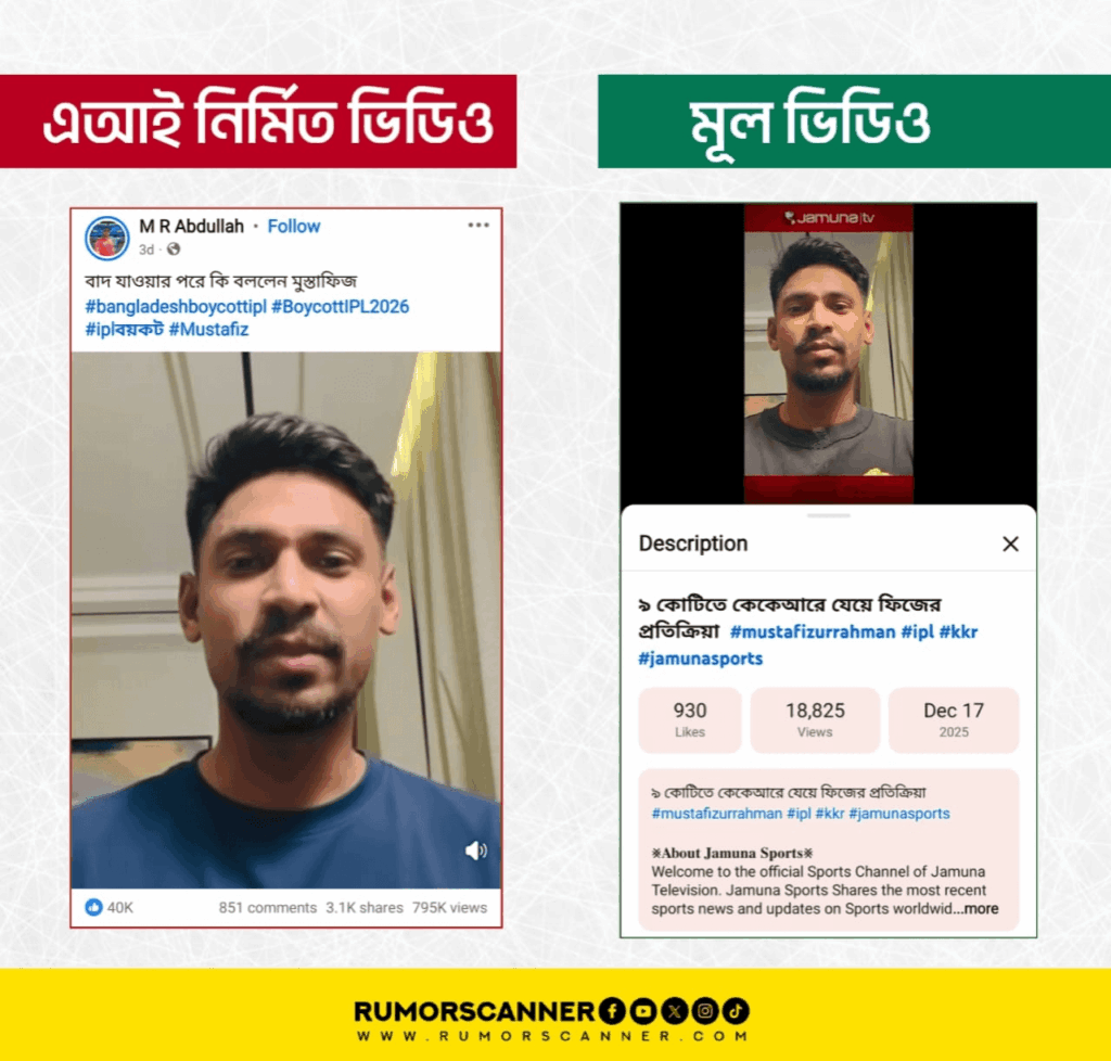 রিউমর স্ক্যানার টিমের অনুসন্ধানে জানা যায়, আইপিএল ২০২৬ মৌসুমে মুস্তাফিজুর রহমানকে স্কোয়াড থেকে বাদ দেওয়ায় তার বক্তব্য দাবিতে প্রচারিত ভিডিওটি আসল নয়। প্রকৃতপক্ষে, এটি কৃত্রিম বুদ্ধিমত্তা (এআই) প্রযুক্তি ব্যবহার করে তৈরি করা একটি ভুয়া ভিডিও।