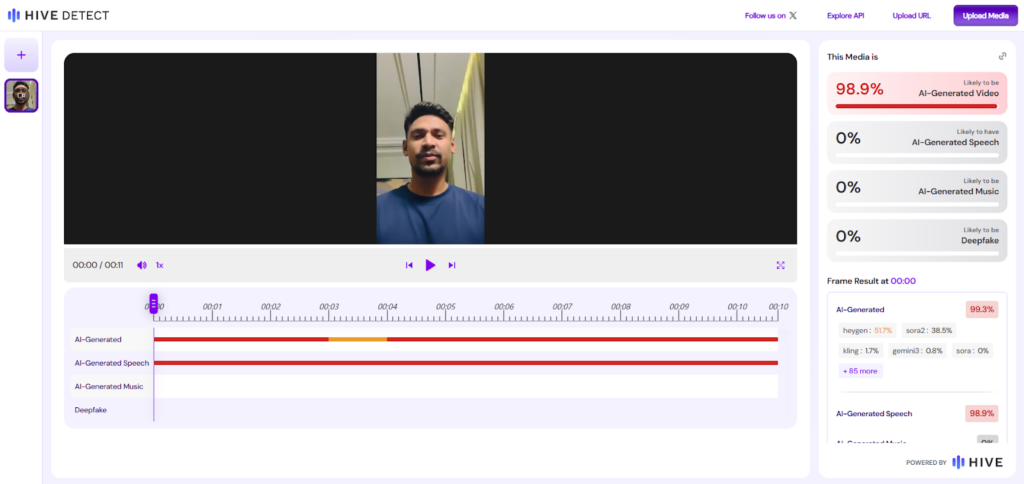 বিষয়টি নিশ্চিত হতে রিউমর স্ক্যানার ভিডিওটি ‘হাইভ মোডারেশন’ টুলের ‘Hive Detect AI’ মডেল দিয়ে পরীক্ষা করে। মডেলটির বিশ্লেষণে দেখা যায়, ভিডিওটি এআই-নির্মিত হওয়ার সম্ভাবনা প্রায় ৯৯ শতাংশ।