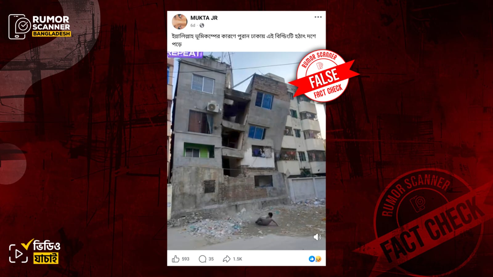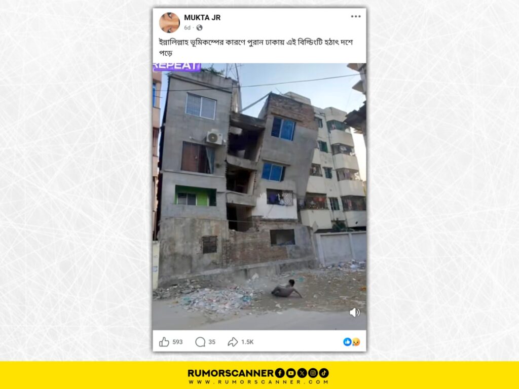 এই পরিস্থিতিতে সামাজিক যোগাযোগ মাধ্যমে একটি ভিডিও ছড়িয়ে দাবি করা হয়, এটি পুরান ঢাকায় একটি ভবন ধসে পড়ার দৃশ্য। ভিডিওতে দেখা যায়, একটি বহুতল ভবন ভেঙে একটি শিশুর ওপর পড়ছে।