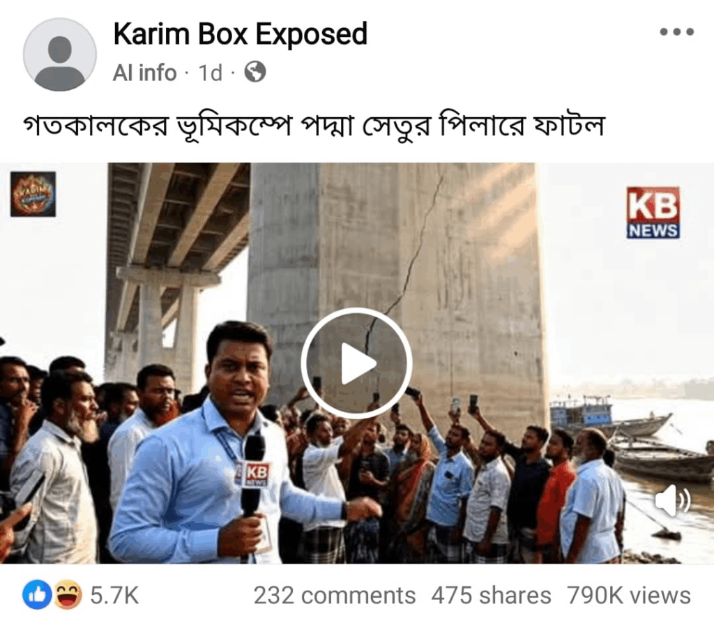 সুতরাং, এআই দিয়ে তৈরি ভিডিওকে সম্প্রতি বাংলাদেশের ভূমিকম্পে পদ্মা সেতুর পিলারে ফাটল ধরেছে দাবিতে প্রচার করা হয়েছে; যা সম্পূর্ণ মিথ্যা।