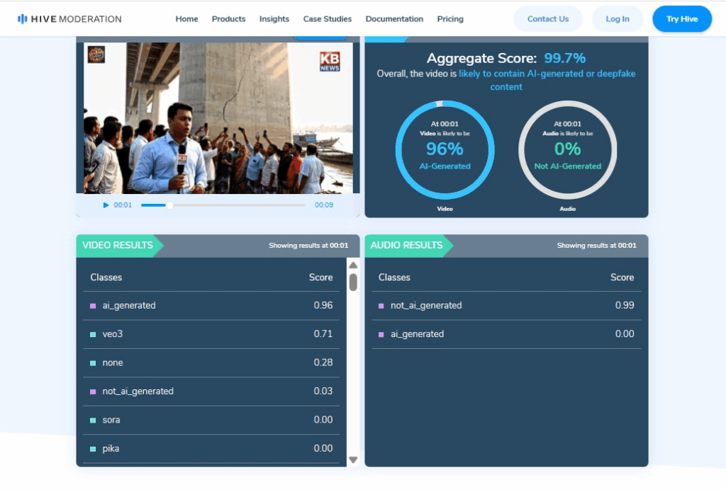 পরবর্তীতে, আলোচিত দাবিতে প্রচারিত এই ভিডিওটি কৃত্রিম বুদ্ধিমত্তার সহায়তায় নির্মিত কিনা তা নিশ্চিত হওয়ার জন্য এআই কনটেন্ট শনাক্তকারী প্ল্যাটফর্ম হাইভ মোডারেশন এবং ডিপফেক-ও-মিটারে পরীক্ষা করলে দেখা যায়, এটি এআই দিয়ে তৈরি হওয়ার সম্ভাবনা সিংহভাগ।
