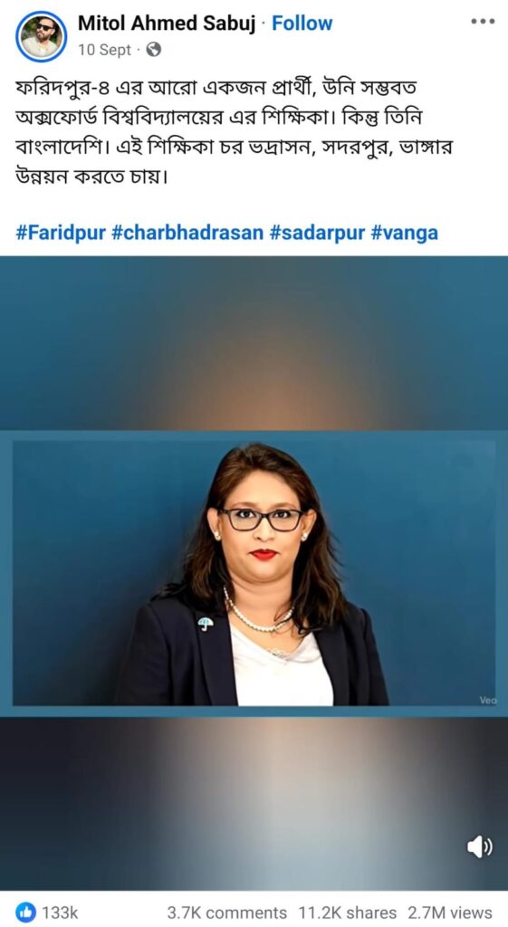 তবে ভিডিওটিতে পুতুলের বলা বক্তব্য কবেকার বা কোথাকার এরূপ কোনো প্রেক্ষাপট উল্লেখ করা হয়নি। ভিডিওটির ক্যাপশনে বলা হয়,‘ফরিদপুর-৪ এর আরো একজন প্রার্থী, উনি সম্ভবত অক্সফোর্ড বিশ্ববিদ্যালয়ের এর শিক্ষিকা। কিন্তু তিনি বাংলাদেশি। এই শিক্ষিকা চর ভদ্রাসন, সদরপুর, ভাঙ্গার উন্নয়ন করতে চায়।’
