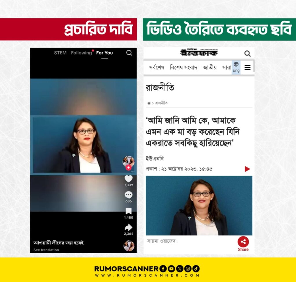সুতরাং, এআই দিয়ে তৈরি ডিপফেক ভিডিওকে সায়মা ওয়াজেদ পুতুলের বক্তব্য দাবিতে প্রচার করা হয়েছে; যা মিথ্যা।