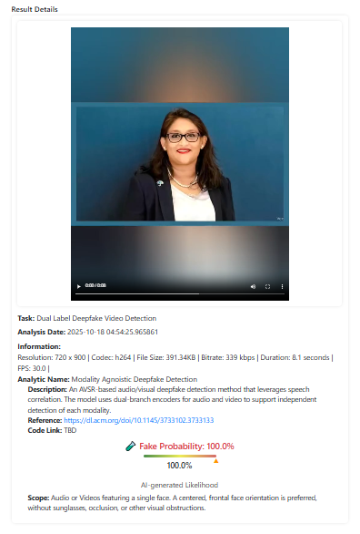 বিষয়টি আরও নিশ্চিত হতে কৃত্রিম বুদ্ধিমত্তার সহায়তায় তৈরি কনটেন্ট শনাক্তকারী টুল ‘ডিপফেক-ও-মিটার’ এর ‘AVSRDD (2025)’ মডেলের মাধ্যমে ভিডিওটি পরীক্ষা করে রিউমর স্ক্যানার। মডেলটির বিশ্লেষণে দেখা যায়, ভিডিওটি এআই দিয়ে তৈরি হওয়ার সম্ভাবনা ১০০ শতাংশ।