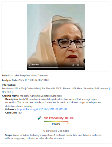 বিষয়টি আরও নিশ্চিত হতে কৃত্রিম বুদ্ধিমত্তার সহায়তায় তৈরি কনটেন্ট শনাক্তকারী টুল ‘ডিপফেক-ও-মিটার’ এর ‘AVSRDD (2025)’ মডেলের মাধ্যমে ভিডিওটি পরীক্ষা করে রিউমর স্ক্যানার। মডেলটির বিশ্লেষণে দেখা যায়, ভিডিওটি এআই দিয়ে তৈরি হওয়ার সম্ভাবনা ১০০ শতাংশ।