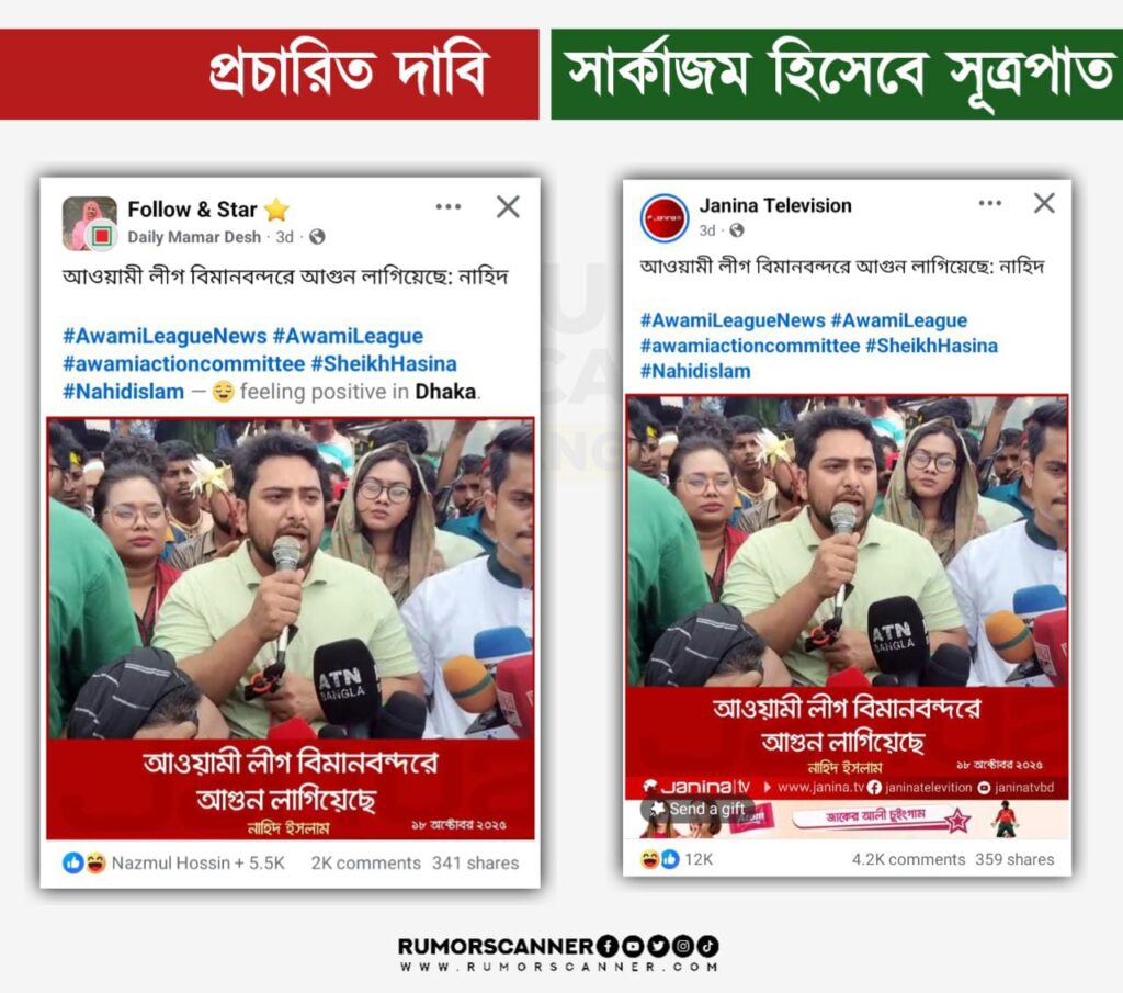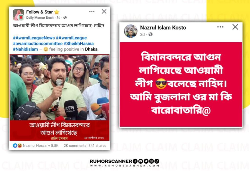 ঢাকার হজরত শাহজালাল আন্তর্জাতিক বিমানবন্দরের কার্গো ভিলেজ কমপ্লেক্স ভবনে গত ১৮ অক্টোবর বেলা আড়াইটার দিকে ভয়াবহ অগ্নিকাণ্ডের ঘটনা ঘটে। ১৩টি ফায়ার স্টেশনের ৩৭টি ইউনিটের প্রায় সাড়ে ছয় ঘণ্টার চেষ্টায় আগুন নিয়ন্ত্রণে আনা হয়। এরই প্রেক্ষিতে সম্প্রতি দাবি প্রচার করা হয়েছে, জাতীয় নাগরিক পার্টির (এনসিপি) আহ্বায়ক নাহিদ ইসলাম মন্তব্য করেছেন “আওয়ামী লীগ বিমানবন্দরে আগুন লাগিয়েছে”।