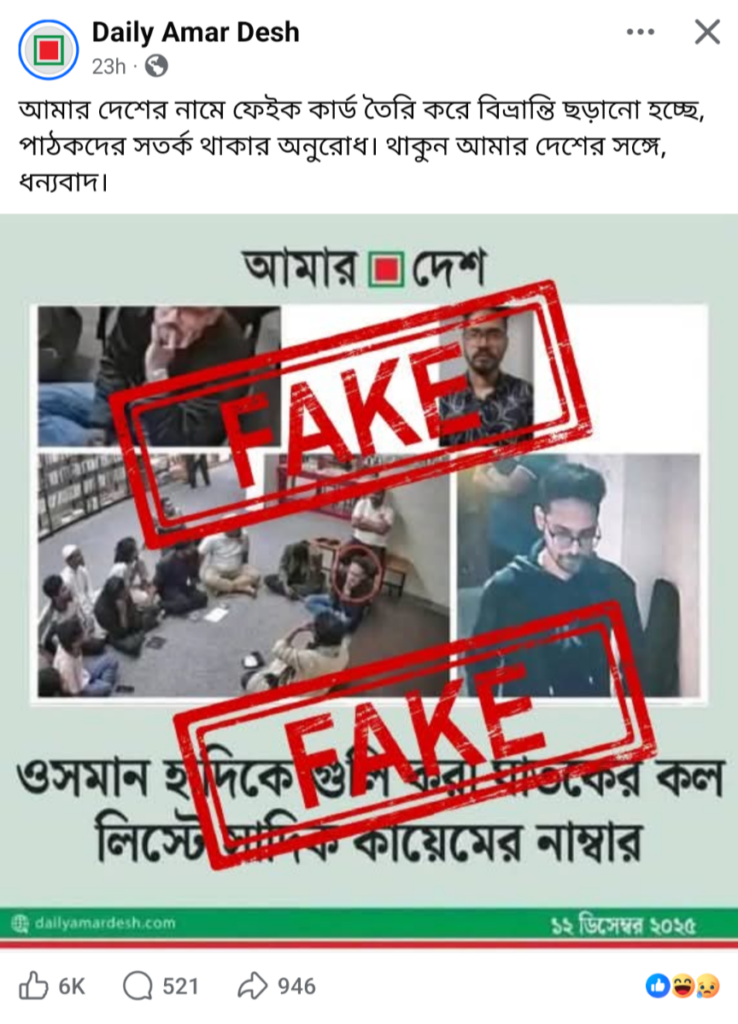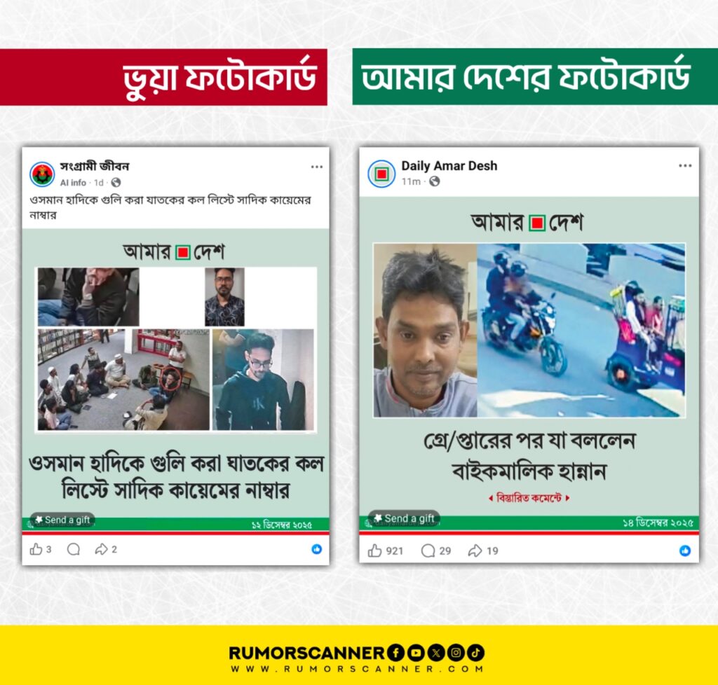 পাশাপাশি ‘ওসমান হাদিকে গুলি করা ঘাতকের কল লিস্টে সাদিক কায়েমের নাম্বার’ শিরোনামে দৈনিক আমার দেশের নামে প্রচারিত ফটোকার্ডটি ভুয়া জানিয়ে গণমাধ্যমটির ফেসবুক পেজে একটি পোস্ট করতেও দেখা যায়।
