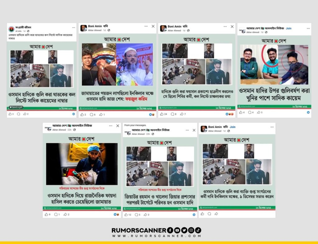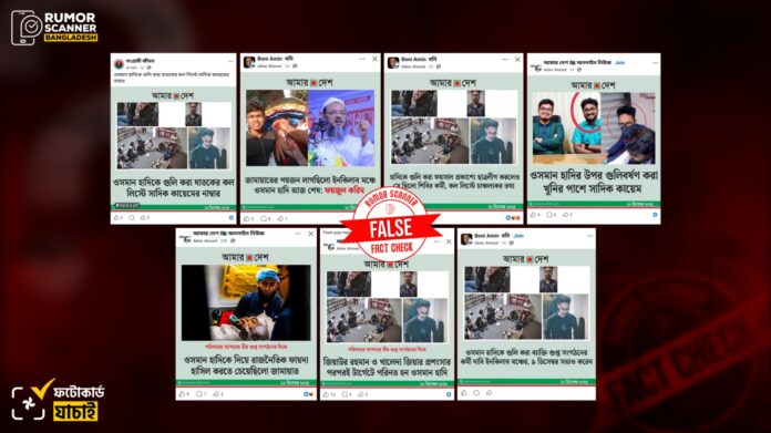 ঢাকা-৮ আসনের সম্ভাব্য স্বতন্ত্র প্রার্থী ও ইনকিলাব মঞ্চের মুখপাত্র শরিফ ওসমান হাদি রাজধানীর বিজয়নগরে গুলিবিদ্ধ হয়েছেন। ১২ ডিসেম্বর রাজধানীর বিজয়নগরের বক্স কালভার্ট এলাকায় তাকে গুলি করা হয়। বর্তমানে তিনি হাসপাতালে চিকিৎসাধীন। এই ঘটনার প্রেক্ষিতে উক্ত হামলার ঘটনার সাথে জামায়াতে ইসলামী, ছাত্রশিবির এবং ইনকিলাব মঞ্চকে জড়িয়ে ভিন্ন ভিন্ন শিরোনামে দৈনিক আমার দেশ পত্রিকার ডিজাইন সংবলিত সাতটি ফটোকার্ড প্রচারিত হতে দেখেছে রিউমর স্ক্যানার।