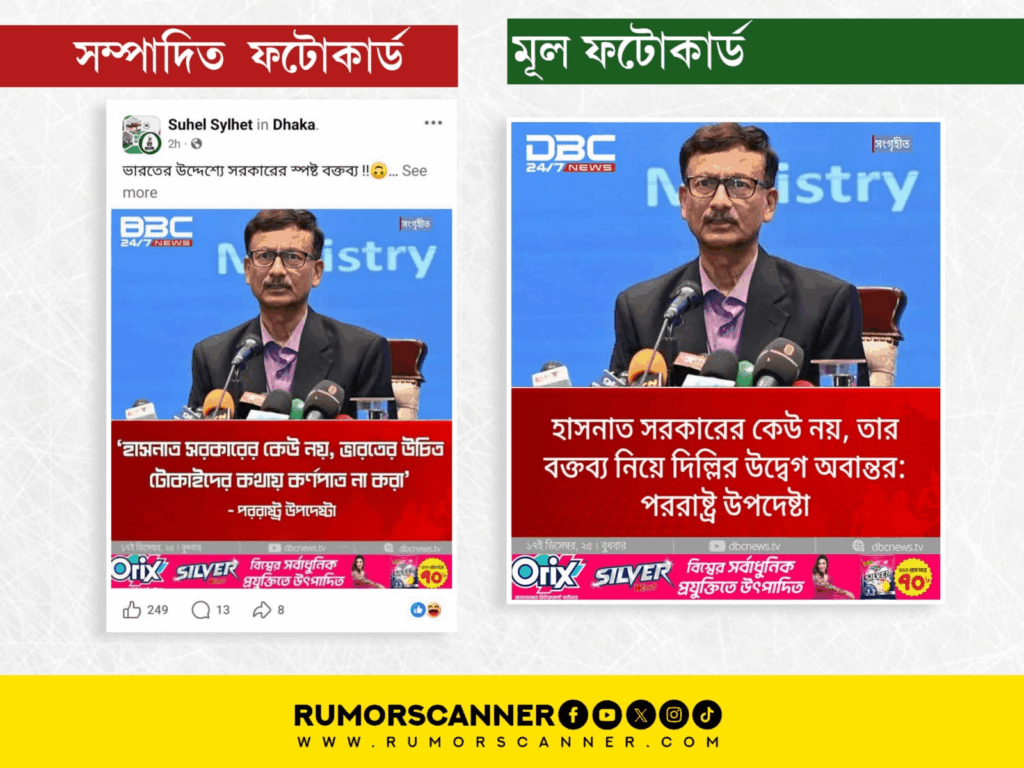 সুতরাং, পররাষ্ট্র উপদেষ্টা তৌহিদ হোসেনকে উদ্ধৃত করে ‘হাসনাত সরকারের কেউ নয়, ভারতের উচিত টোকাইদের কথায় কর্ণপাত না করা’ শিরোনামে ডিবিসি নিউজের নামে প্রচারিত ফটোকার্ডটি সম্পাদিত।