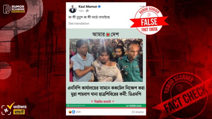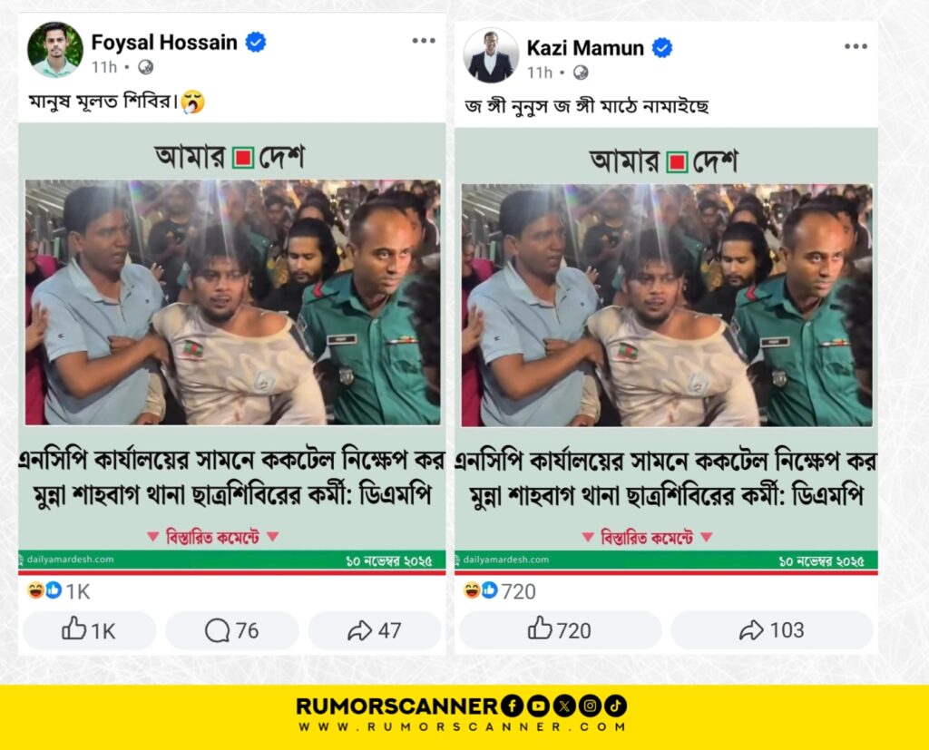 সুতরাং, ‘এনসিপি কার্যালয়ের সামনে ককটেল নিক্ষেপ করা মুন্না শাহবাগ থানা শাহবাগ থানা ছাত্রশিবিরের কর্মী: ডিএমপি’ শীর্ষক তথ্যে বা শিরোনামে আমার দেশের নামে পরিচালিত ফটোকার্ডটি ভুয়া।