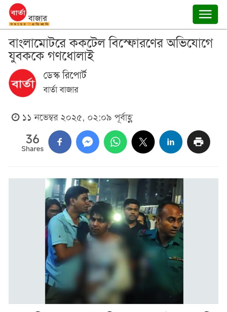 রাজধানীর রমনা থানাধীন বাংলামোটরে জাতীয় নাগরিক পার্টির (এনসিপি) কার্যালয়ের সামনে মোটরসাইকেলযোগে এসে ককটেল বিস্ফোরণ করে পালিয়ে যাওয়ার সময় মো. মাসুদুর রহমান নামে এক যুবককে ধরে গণধোলাই দেয় জনতা।