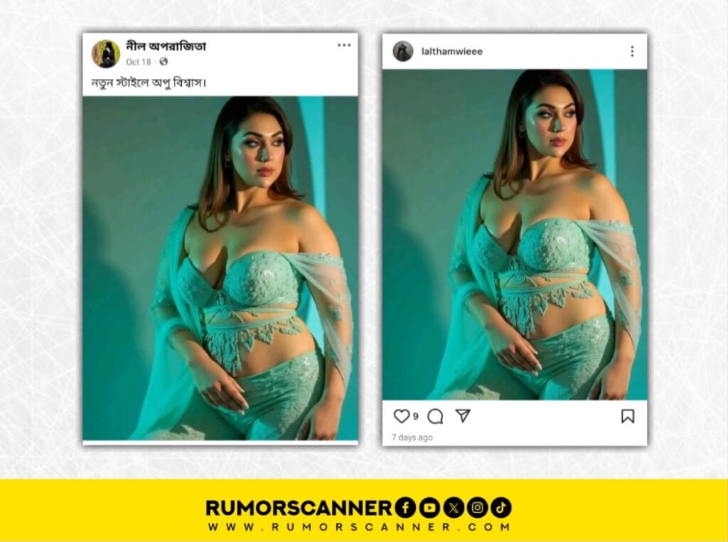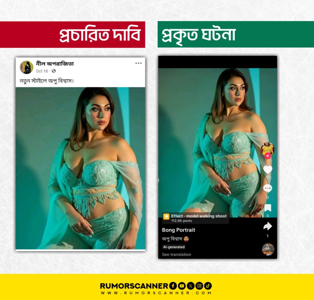রিউমর স্ক্যানার টিমের অনুসন্ধানে জানা যায়, আলোচিত ছবিটি অপু বিশ্বাসের নয়। প্রকৃতপক্ষে, কৃত্রিম বুদ্ধিমত্তার (এআই) সহায়তায় তৈরি একটি ভিডিওর স্থিরচিত্রকে অপু বিশ্বাসের আসল ছবি দাবিতে প্রচার করা হয়েছে৷