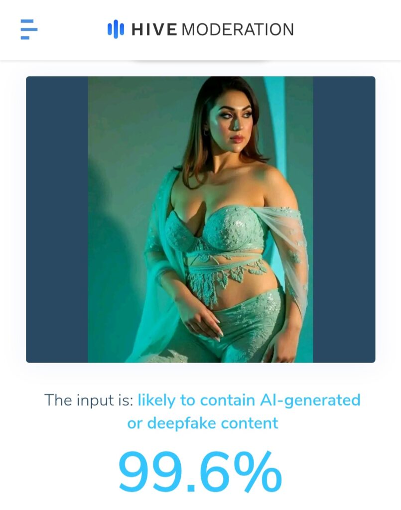 উক্ত ভিডিওটির বিষয়ে নিশ্চিত হতে এআই কনটেন্ট শনাক্তকারী প্ল্যাটফর্ম ‘Hive Moderation ’ মাধ্যমে ছবিটি পরীক্ষা দেখা যায়, ছবিটি এআই দিয়ে তৈরি হওয়ার সম্ভাবনা প্রায় ১০০ শতাংশ।