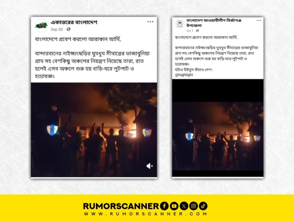 রিউমর স্ক্যানার টিমের অনুসন্ধানে জানা যায়, আরাকান আর্মি কর্তৃক বান্দারবানের নাইক্ষ্যংছড়ির ঘুমধুম সীমান্তের বেশকিছু অঞ্চল নিয়ন্ত্রণে নেওয়া এবং সেখানে লুটপাত চালানোর মতো কোনো ঘটনা ঘটেনি। প্রকৃতপক্ষে, ২০২৩ সালে মায়ানমারের কিছু বিদ্রোহী গোষ্ঠীর দেশটির নিয়াংপিন্থা পুলিশ স্টেশন দখল করার ভিডিওকে বান্দরবানে আরাকান আর্মির নিয়ন্ত্রণ দাবিতে প্রচার করা হয়েছে।