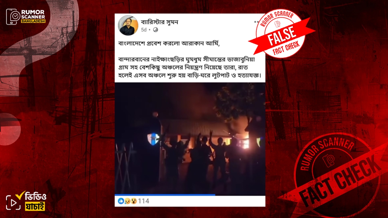 সম্প্রতি ‘বাংলাদেশে প্রবেশ করলো আরাকান আর্মি, বান্দারবানের নাইক্ষ্যংছড়ির ঘুমধুম সীমান্তের ভাজাবুনিয়া গ্রাম সহ বেশকিছু অঞ্চলের নিয়ন্ত্রণ নিয়েছে তারা, রাত হলেই এসব অঞ্চলে শুরু হয় বাড়ি-ঘরে লুটপাট ও হত্যাযজ্ঞ।…’ ক্যাপশনে একটি ভিডিও সামাজিক যোগাযোগ মাধ্যমে প্রচার করা হয়েছে।
