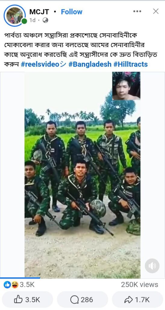 সম্প্রতি সামাজিক যোগাযোগ মাধ্যমে বাংলাদেশ সেনাবাহিনীর উদ্দেশ্যে পার্বত্য সশস্ত্র গোষ্ঠীর আদলে একদল সশস্ত্র ব্যক্তির বক্তব্যের একটি ভিডিও প্রচার করা হয়েছে যেখানে তাদেরকে বলতে শোনা যায়, ‘বাংলাদেশ সেনাবাহিনী যতই চেষ্টা করুক, এই পার্বত্য অঞ্চল থেকে আমাদের কোনোদিন বিতাড়িত করতে পারবে না। কারণ এই পাহাড় আমাদের। বাংলাদেশ সেনাবাহিনীকে উদ্দেশ্য করে বলছি, তারা যদি এত শক্তিশালী হয়ে থাকে তাহলে তারা আমাদের সাথে মোকাবেলা করুক। আমরাও প্রস্তুত আছি। খেলা হবে।’