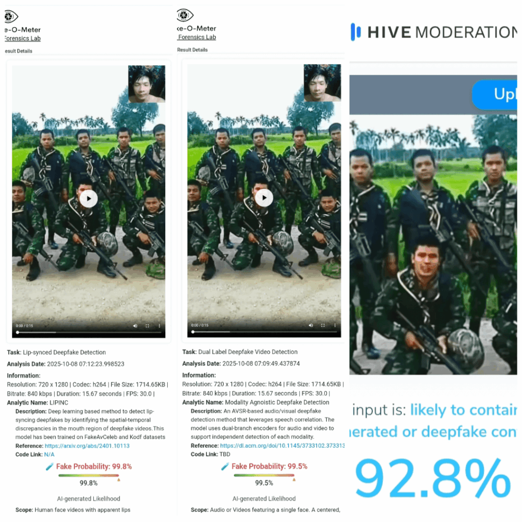 এ বিষয়ে অধিকতর নিশ্চিত হতে এআই ও ডিপফেক কনটেন্ট শনাক্তকারী প্ল্যাটফর্ম ‘ডিপফেক ও মিটার’ এ আলোচিত ভিডিওটি বিশ্লেষণ করলে এটি ভুয়া হওয়ার সম্ভাবনা বেশি দেখা যায়। প্ল্যাটফর্মটির ‘AVSRDD’, ‘LIPINC’ ও ‘XCLIP’ ডিটেক্টরের বিশ্লেষণমতে ভিডিওটি ভুয়া বা এআই তৈরি হওয়ার সম্ভাবনা যথাক্রমে ৯৯.৫ শতাংশ, ৯৯.৮ শতাংশ ও ৯৯.৮ শতাংশ। এছাড়াও, এআই কনটেন্ট শনাক্তকারী আরেক প্ল্যাটফর্ম ‘হাইভ মডারেশন’ এর বিশ্লেষণমতে আলোচিত ভিডিওটি এআই দিয়ে তৈরি কনটেন্ট হওয়ার সম্ভাবনা ৯২.৮ শতাংশ।