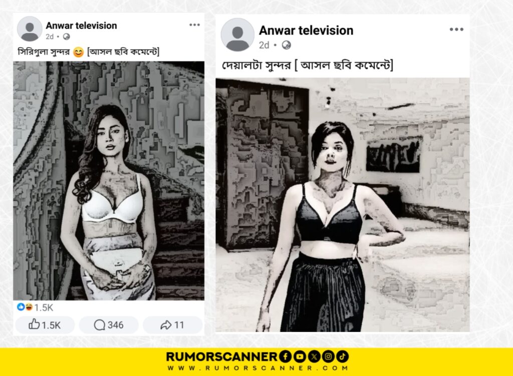 ছবি দুইটির সম্পাদনাকারী Anwar television নামের পেজটি পর্যালোচনা করে দেখা যায়, পেজটির পরিচিতি অংশে পেজটি বিনোদনের উদ্দেশ্যে তৈরি করা বলে জানানো হয়েছে। তবে পেজটিতে নিয়মিত বিভিন্ন নারীর ছবি সম্পাদনা করে আপত্তিকরভাবে তুলে ধরা হচ্ছে। এতে করে নারীর সম্মানহানি যেমন ঘটছে, তেমনি উক্ত নারী সমাজে হেয় প্রতিপন্ন হচ্ছেন।