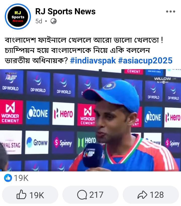 গত ২৮ সেপ্টেম্বর পুরুষদের এশিয়া কাপের ফাইনালে মুখোমুখি হয় ভারত ও পাকিস্তান। পাকিস্তানের ১৪৭ রানের টার্গেটে ব্যাট করতে নেমে ২ বল হাতে রেখে ৫ উইকেটে ম্যাচ জিতে নেয় সূর্যকুমার যাদবের নেতৃত্বাধীন ভারতীয় ক্রিকেট দল। সম্প্রতি এরই প্রেক্ষিতে একটি কথিত সংবাদ প্রতিবেদন প্রচার করে দাবি করা হয়েছে, ফাইনালে পাকিস্তানকে হারিয়ে সূর্যকুমার যাদব বলেছেন, ‘পাকিস্তান আমাদের কাছে এখন সবসময়ই পুচকে দল। বাংলাদেশের সাথে ফাইনাল জমে যায়। বাংলাদেশ থাকলে তারা ফাইনালে আরো ভালো খেলতো।’