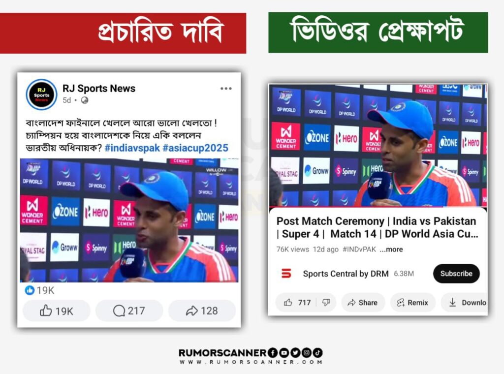 রিউমর স্ক্যানার টিমের অনুসন্ধানে জানা যায়, এশিয়া কাপের ফাইনালে পাকিস্তানের জায়গায় বাংলাদেশ ফাইনাল খেললে আরো ভালো খেলতো শীর্ষক কোনো মন্তব্য করেননি সূর্যকুমার যাদব। প্রকৃতপক্ষে, কোনোরকম নির্ভরযোগ্য তথ্যপ্রমাণ ছাড়াই ফাইনাল ম্যাচের আগের একটি ম্যাচ পরবর্তী প্রেজেন্টেশনের সূর্যকুমারের অপ্রাসঙ্গিক বক্তব্যের খন্ডাংশ সংযুক্ত করে আলোচিত দাবি প্রচার করা হয়েছে।