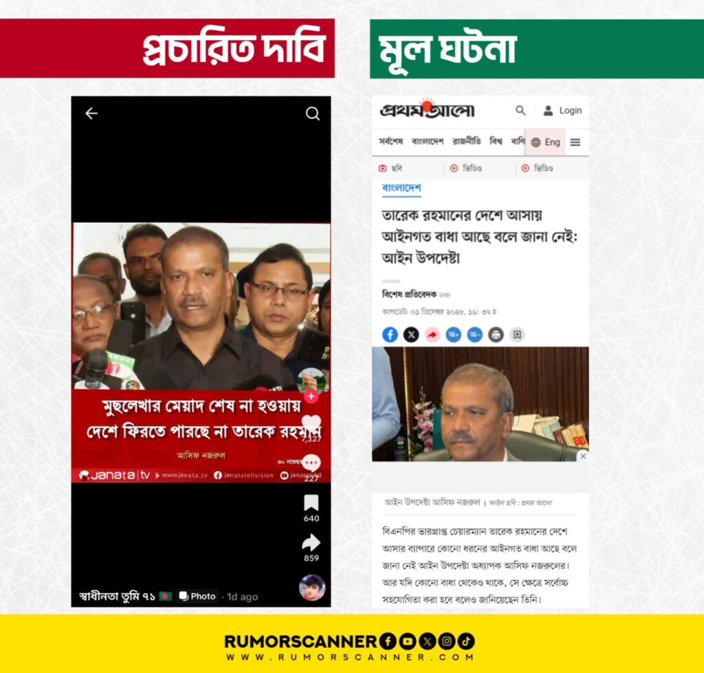 পরবর্তীতে, এ বিষয়ে আরো অনুসন্ধান করে দৈনিক প্রথম আলোর ওয়েবসাইটে ১ ডিসেম্বর প্রকাশিত একটি প্রতিবেদন থেকে জানা যায়, সেদিন সচিবালয়ে সাংবাদিকদের প্রশ্নের জবাবে আইন উপদেষ্টা অধ্যাপক আসিফ নজরুল বলেন বিএনপির ভারপ্রাপ্ত চেয়ারম্যান তারেক রহমানের দেশে আসার ব্যাপারে কোনো ধরনের আইনগত বাধা আছে বলে জানা নেই। আর যদি কোনো বাধা থেকেও থাকে, সে ক্ষেত্রে সর্বোচ্চ সহযোগিতা করা হবে বলেও জানিয়েছেন তিনি।
