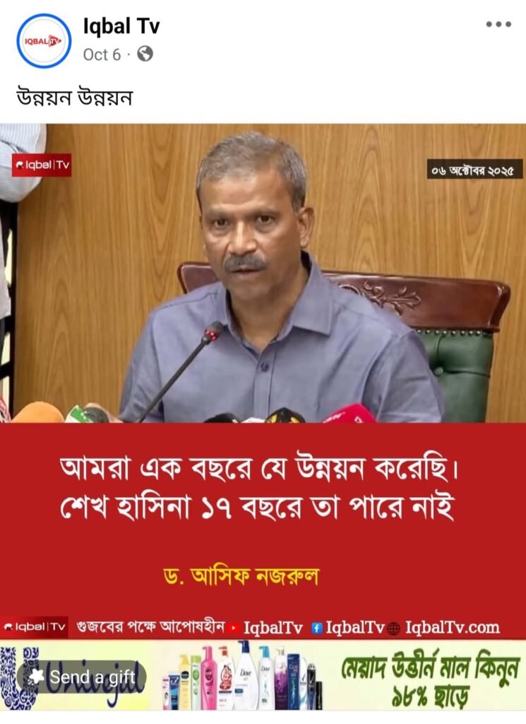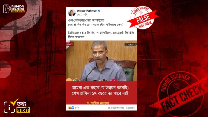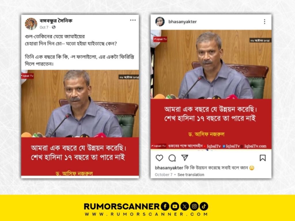 সম্প্রতি ‘আমরা এক বছরে যে উন্নয়ন করেছি। শেখ হাসিনা ১৭ বছরে তা পারে নাই – ড. আসিফ নজরুল’ শীর্ষক শিরোনামের একটি ফটোকার্ড ইন্টারনেটের বিভিন্ন প্লাটফর্মে প্রচার করা হয়েছে।