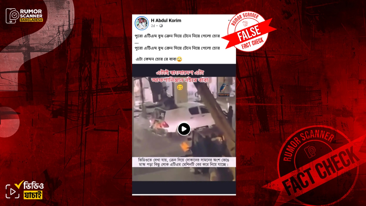 রিউমর স্ক্যানার টিমের অনুসন্ধানে জানা যায়, প্রকাশ্যে ক্রেন দিয়ে টেনে এটিএম মেশিন চুরি করে নিয়ে যাওয়ার ঘটনাটি বাংলাদেশের নয়। প্রকৃতপক্ষে, গত অক্টোবর মাসে যুক্তরাজ্যে ঘটে যাওয়া এটিএম চুরির ঘটনাকে বাংলাদেশের দাবিতে প্রচার করা হয়েছে৷