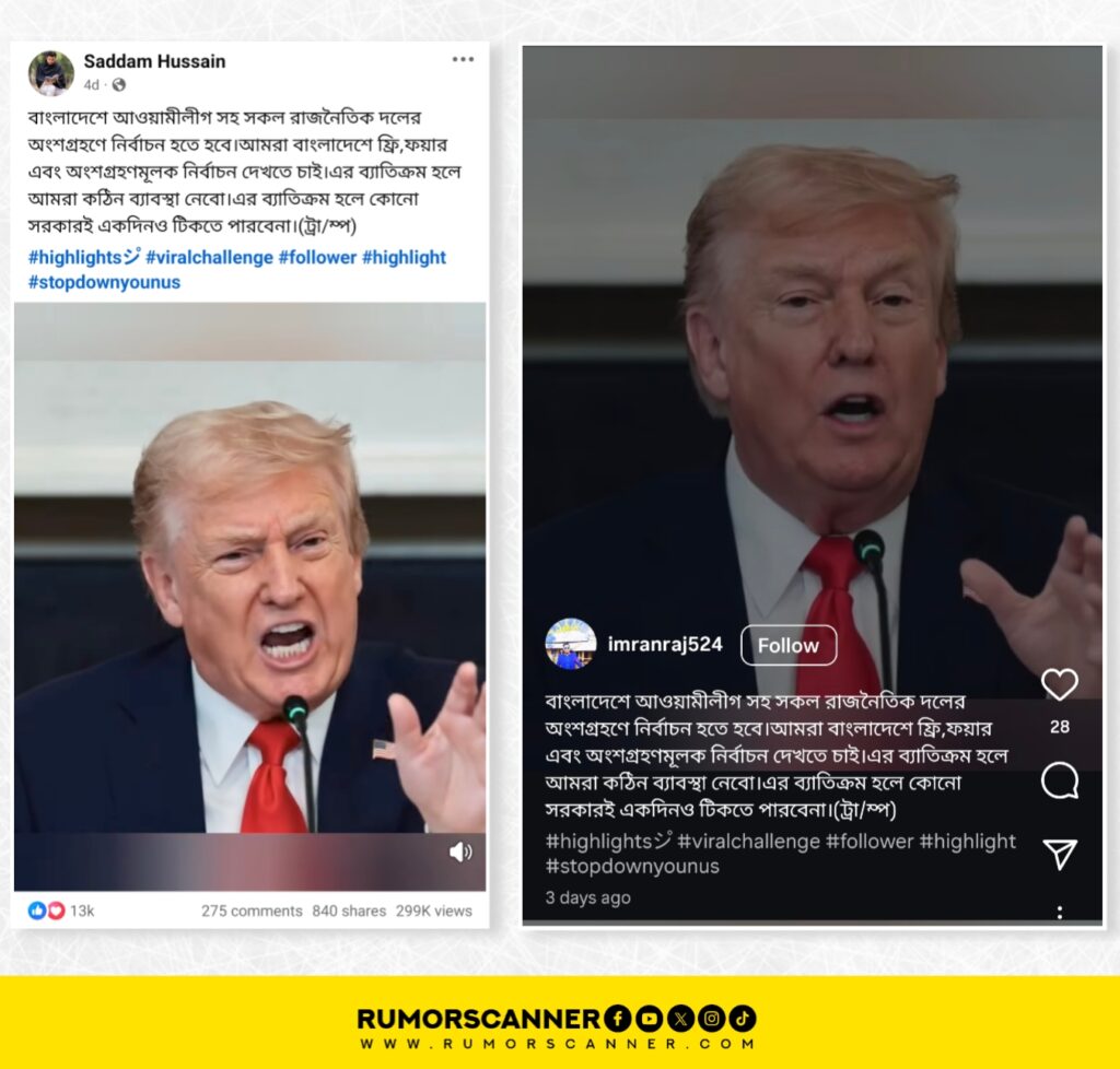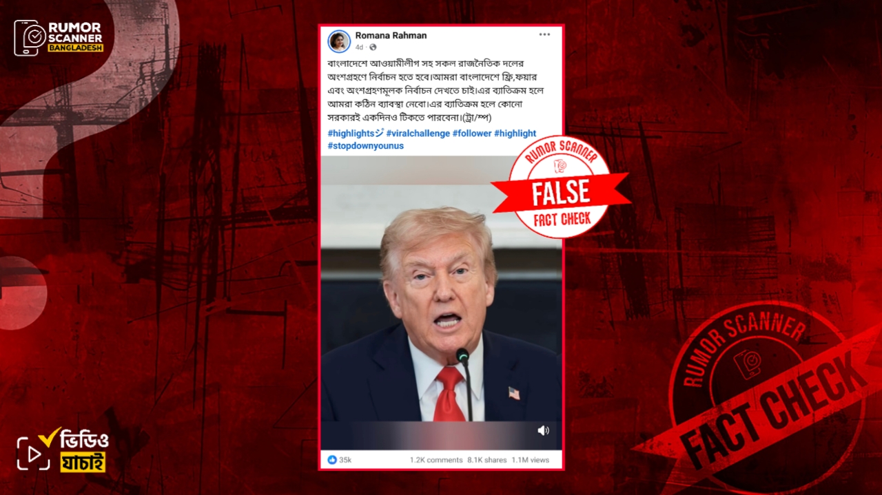 রিউমর স্ক্যানার টিমের অনুসন্ধানে জানা যায়, বাংলাদেশে আসন্ন ত্রয়োদশ জাতীয় সংসদ নির্বাচন প্রসঙ্গে আ.লীগ সহ সকল দলের অংশগ্রহণে অবাধ, নিরপেক্ষ ও অংশগ্রহণমূলক নির্বাচন দেখতে চাই, না হলে কঠিন ব্যবস্থা নেওয়া হবে শীর্ষক কোনো মন্তব্য যুক্তরাষ্ট্রের প্রেসিডেন্ট ডোনাল্ড ট্রাম্প করেননি। প্রকৃতিপক্ষে, কৃত্রিম বুদ্ধিমত্তা বা এআই দিয়ে তৈরি একটি ভিডিও বাস্তব দাবিতে প্রচার করা হচ্ছে।