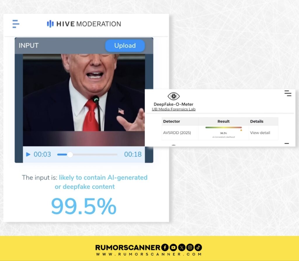 বিষয়টি অধিকতর যাচাইয়ের জন্য কৃত্রিম বুদ্ধিমত্তার সহায়তায় তৈরি কনটেন্ট শনাক্তকারী টুল ‘ডিপফেক-ও-মিটার’ এর ‘AVSRDD (2025)’ মডেলে এবং হাইভ মডারেশনের মাধ্যমে ভিডিওটি পরীক্ষা করে রিউমর স্ক্যানার। মডেলটির বিশ্লেষণে দেখা যায়, ভিডিওটি এআই দিয়ে তৈরি হওয়ার সম্ভাবনা ৯৮.০৩% এবং ৯৯.৫%।