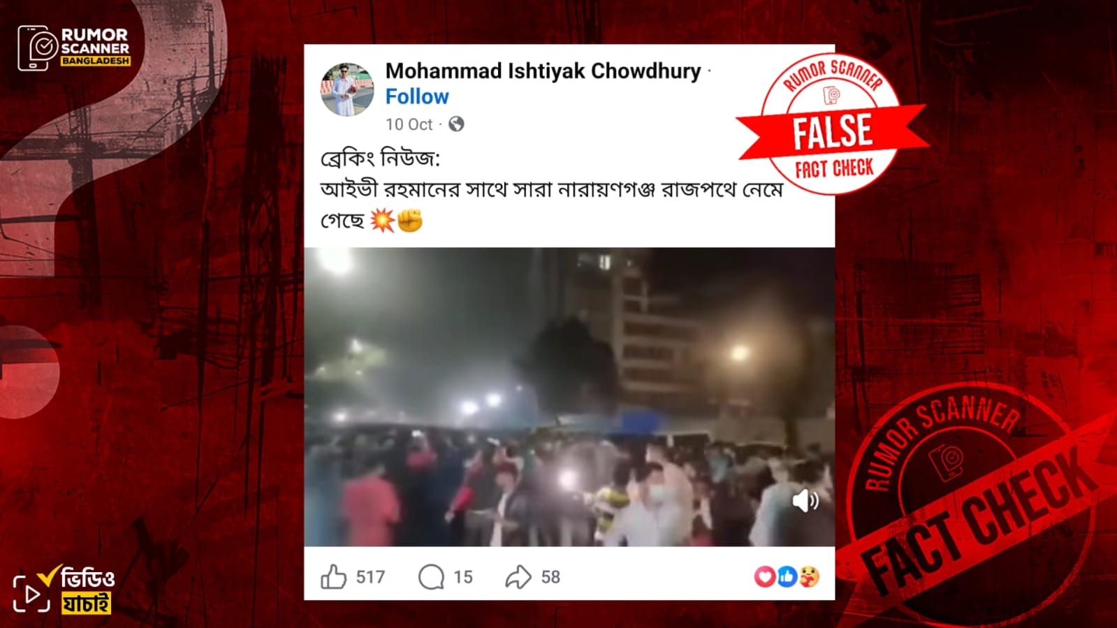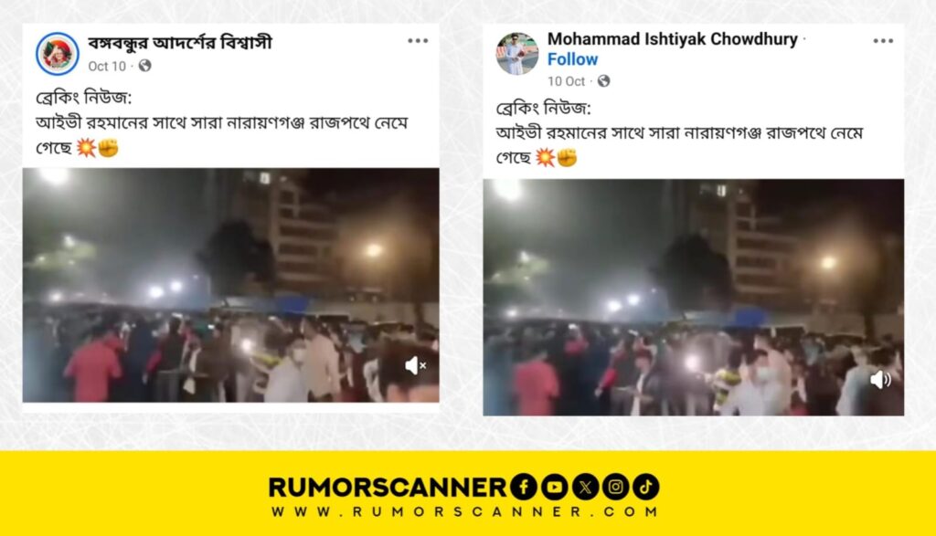 রিউমর স্ক্যানার টিমের অনুসন্ধানে জানা যায়, প্রচারিত ভিডিওটি সাম্প্রতিক সময়ের নয় এবং এটি নারায়ণগঞ্জে ডা. সেলিনা হায়াৎ আইভীর নেতৃত্বে কার্যক্রম নিষিদ্ধ আওয়ামী লীগের কোনো মিছিলের নয়। প্রকৃতপক্ষে, ২০২০ সালে কুষ্টিয়ায় শেখ মুজিবুর রহমানের নির্মাণাধীন ভাস্কর্য ভাংচুরের প্রতিবাদে ঢাকার গুলিস্তানের শহীদ আবরার ফাহাদ অ্যাভিনিউ এলাকায় (সাবেক বঙ্গবন্ধু অ্যাভিনিউ) নিষিদ্ধ ঘোষিত বাংলাদেশ ছাত্রলীগের বিক্ষোভ মিছিল করে। এটি সেই ঘটনারই একটি ভিডিও।