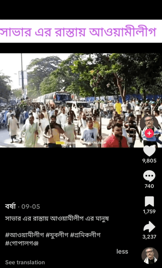 গত ০৫ সেপ্টেম্বরে ঢাকার সাভারের রাস্তায় কার্যক্রম নিষিদ্ধ আওয়ামী লীগের মিছিলের দৃশ্য দাবিতে একটি ভিডিও সামাজিক যোগাযোগমাধ্যমে প্রচার করা হয়েছে।
