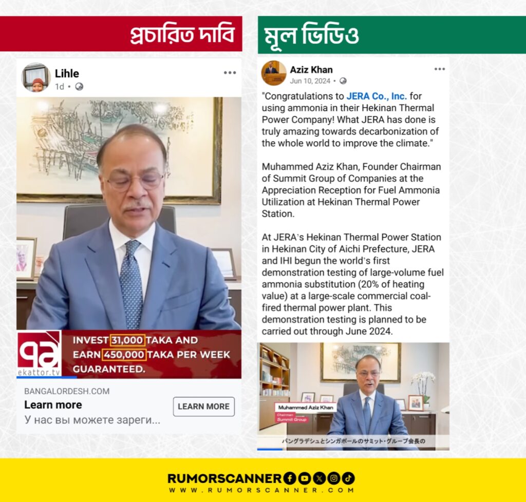 সম্প্রতি, সামিট গ্রুপের চেয়ারম্যান মুহাম্মদ আজিজ খানের কথিত বক্তব্যের একটি ভিডিও প্রচার করে দাবি করা হচ্ছে, ৩১ হাজার টাকা বিনিয়োগ করলে সপ্তাহে সাড়ে চার লক্ষ টাকা পাওয়া যাবে।