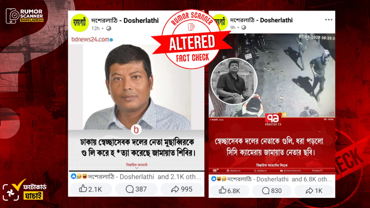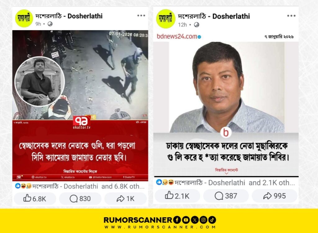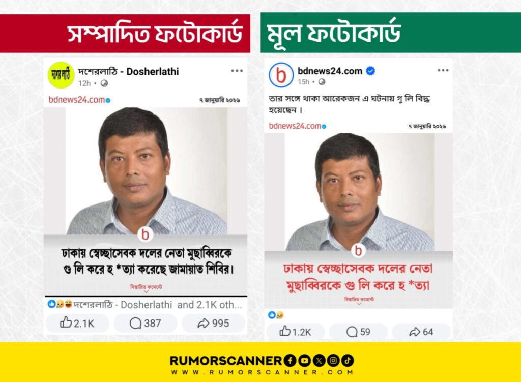 রাজধানীর তেজগাঁওয়ের তেজতুরী বাজার এলাকায় বিএনপির অঙ্গসংগঠন স্বেচ্ছাসেবক দলের নেতা আজিজুর রহমান ওরফে মুছাব্বিরকে গুলি করে হত্যার ঘটনা ঘটেছে গত ০৭ জানুয়ারি। এর প্রেক্ষিতে দুইটি গণমাধ্যমের আদলে দুইটি ফটোকার্ড প্রচার করা হয়েছে।