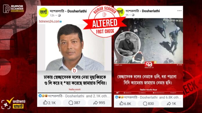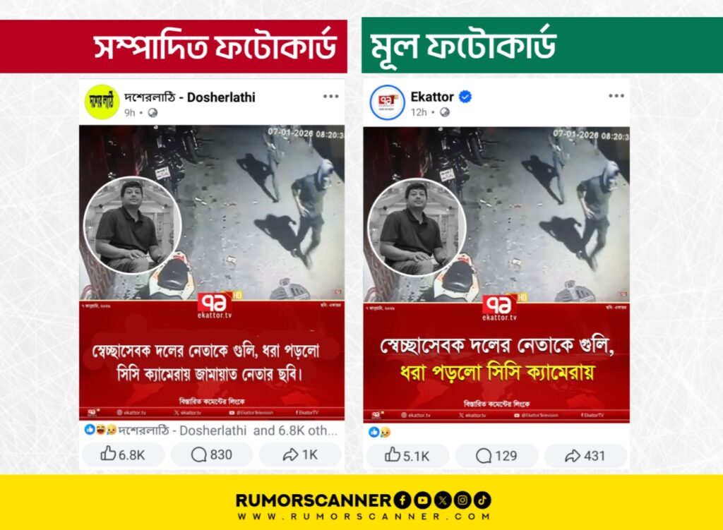 একাত্তর টিভির নামে প্রচারিত ফটোকার্ডে উল্লেখ করা হয়েছে, ‘স্বেচ্ছাসেবক দলের নেতাকে গুলি, ধরা পড়লো সিসি ক্যামেরায় জামায়াত নেতার ছবি।’