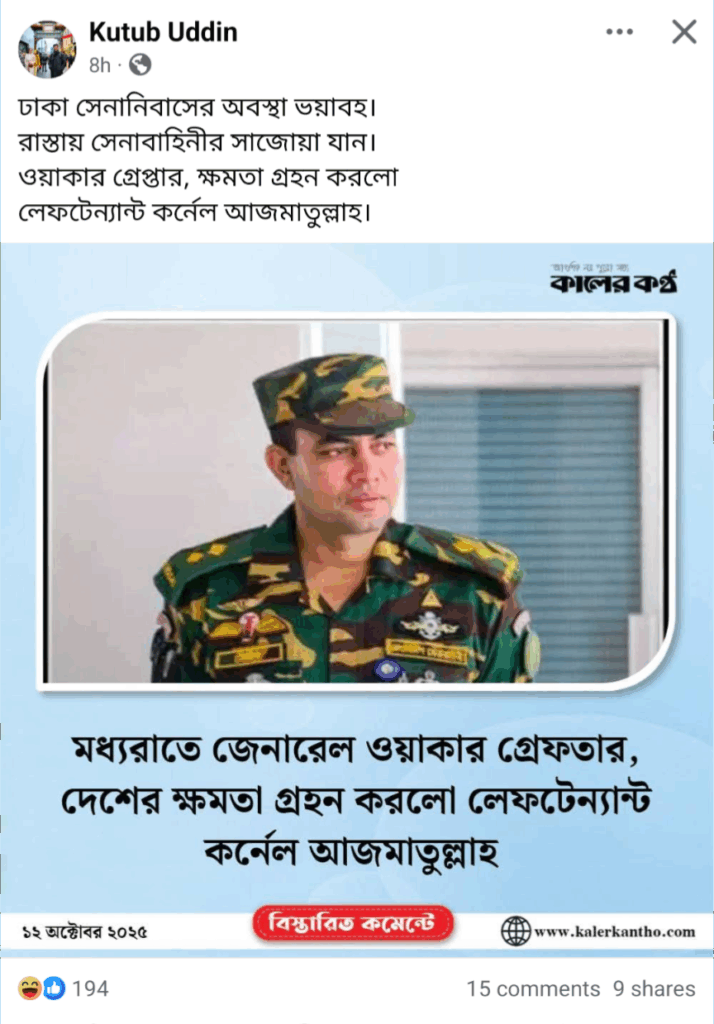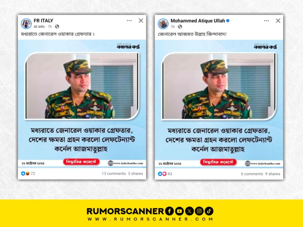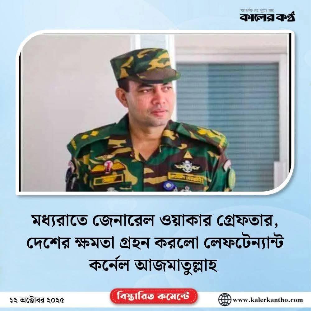 গত ১২ অক্টোবর মধ্যরাত থেকে সামাজিক যোগাযোগ মাধ্যমে ‘মধ্যরাতে জেনারেল ওয়াকার গ্রেফতার দেশের ক্ষমতা গ্রহণ করলো লেফটেন্যান্ট কর্নেল আজমাতুল্লাহ’ শীর্ষক শিরোনামে কালের কণ্ঠের লোগো সম্বলিত একটি ফটোকার্ড প্রচার করা হচ্ছে।