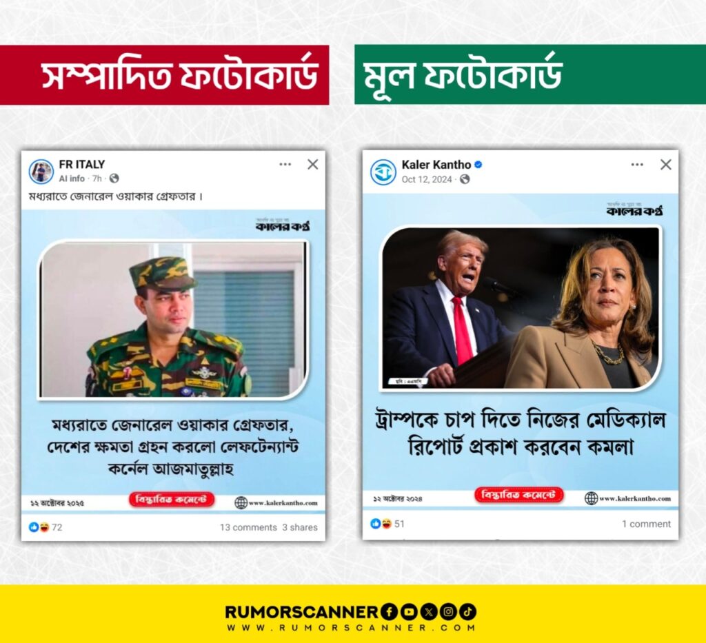 কালের কণ্ঠের উক্ত ডিজাইনের বিষয়ে অনুসন্ধানে দেখা যায়, ২০২৪ সালে কালের কণ্ঠ ফটোকার্ড তৈরিতে আলোচিত ফটোকার্ডটিতে ব্যবহৃত ফরমেট ব্যবহার করতো। ধারণা করা যাচ্ছে সে বছরের ১২ অক্টোবরে প্রচারিত উক্ত ফটোকার্ডটি ডিজিটাল প্রযুক্তির সহায়তায় সম্পাদনা করে আলোচিত ফটোকার্ডটি তৈরি করা হয়েছে। কারণ আলোচিত ফটোকার্ডে সেনা কর্মকর্তার ছবির দুইপাশে কালো রঙ দেখা যাচ্ছে। উক্ত ফটোকার্ডটিতে ব্যবহৃত ট্রাম্পের ছবির একই স্থানে কালো রঙ রয়েছে।