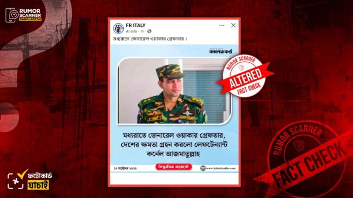 রিউমর স্ক্যানার টিমের অনুসন্ধানে জানা যায়, সেনাপ্রধান জেনারেল ওয়াকার-উজ-জামানের গ্রেফতার ও লেফটেন্যান্ট কর্নেল আজমাতুল্লাহ নামের কথিত সেনা কর্মকর্তার দেশের ক্ষমতা গ্রহণের দাবিটি সঠিক নয়। প্রকৃতপক্ষে, বাংলাদেশ সেনাবাহিনীতে লেফটেন্যান্ট কর্ণেল আজমাতুল্লাহ নামের কোনো সেনা কর্মকর্তার সন্ধান পাওয়া যায়নি। এছাড়াও সেনাপ্রধান জেনারেল ওয়াকার-উজ-জামানকে গ্রেফতারও করা হয়নি। মূলত, ডিজিটাল প্রযুক্তির সহায়তায় কালের কণ্ঠের লোগো ব্যবহার করে সম্পূর্ণ ভিত্তিহীনভাবে আলোচিত দাবিতে প্রচারিত ফটোকার্ডটি তৈরি করা হয়েছে।