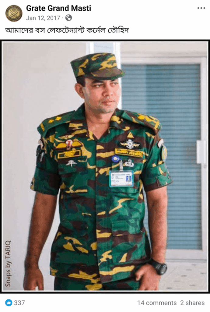পোস্টটিতে উল্লেখ করা হয়, উক্ত সেনা কর্মকর্তার নাম লেফটেন্যান্ট কর্নেল তৌহিদ। উক্ত ব্যক্তির ছবিতেও তার ব্যাজে তৌহিদ নামটি লেখা দেখতে পাওয়া যায়। তবে পরবর্তী অনুসন্ধানে তার বিষয়ে বিস্তারিত কোনো তথ্য পাওয়া যায়নি। কিন্তু এটি নিশ্চিত হওয়া গিয়েছে যে উক্ত ব্যক্তির নাম লেফটেন্যান্ট কর্নেল আজমাতুল্লাহ নয়।