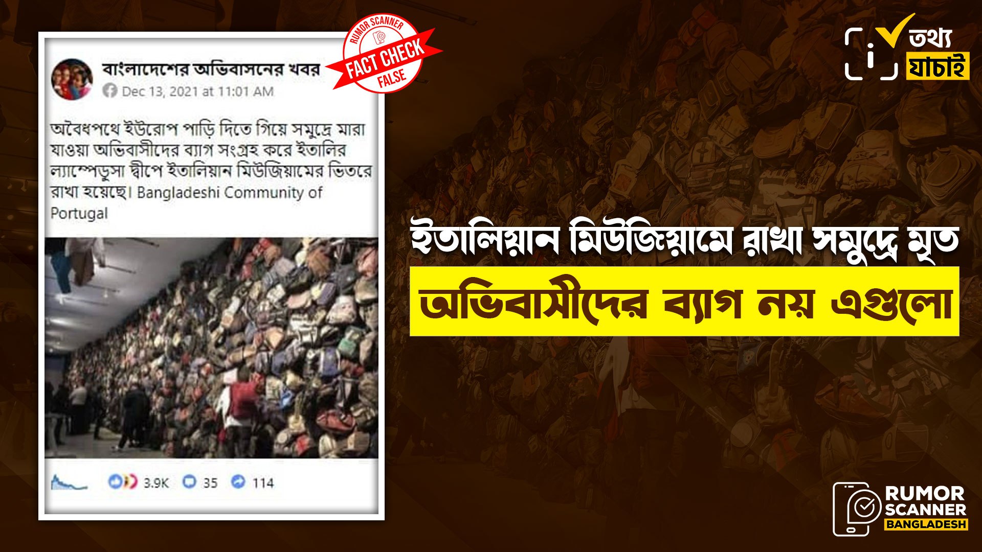 সম্প্রতি “অবৈধপথে ইউরোপ পাড়ি দিতে গিয়ে সমুদ্রে মারা যাওয়া অভিবাসীদের ব্যাগ সংগ্রহ করে ইতালির ল্যাম্পেডুসা দ্বীপে ইতালিয়ান মিউজিয়ামের ভিতরে রাখা হয়েছে।” শীর্ষক শিরোনামে অসংখ্য ব্যাগের ছবি সম্বলিত একটি তথ্য সামাজিক যোগাযোগ মাধ্যম ফেসবুকে ছড়িয়ে পড়েছে।